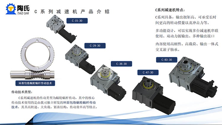 型号: C-15-30 C-29-30 C-36-30 C-47-30 C-83-30 环面包络蜗轮蜗杆传动技术 传动技术类型: C系列减速机的传动类型为蜗轮蜗杆传动,其中的核心传动技术使用的是由我司独立研发的环面包络蜗轮蜗杆传动技术,其具高转速、大负载、紧凑结构、传动效率高等特点。 C系列减速机特点: