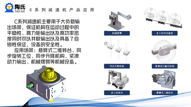 C系列具备,输出扭矩高、可承受长时间更高的转动惯量以及冲击力等。多功能设计,可以实现多台减速机串联使用、双动力源输出、多种输出接口内部使用高刚性、高载荷、输出一体式交叉滚子轴承。