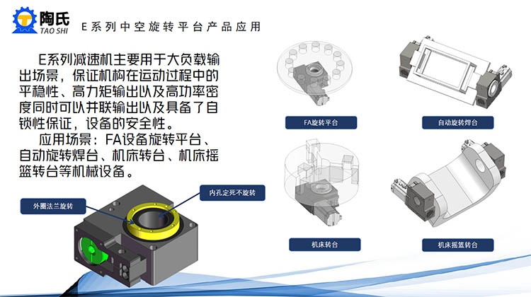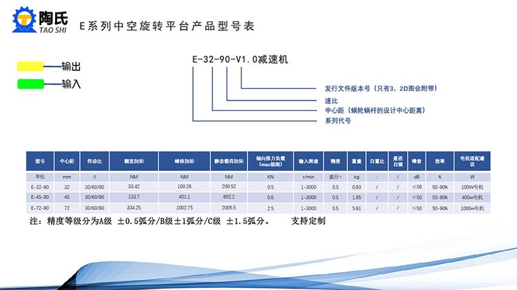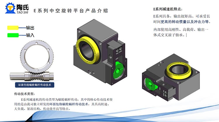 环面包络蜗轮蜗杆传动技术 传动技术类型: E系列减速机的传动类型为蜗轮蜗杆传动,其中的核心传动技术使用的是由我司独立研发的环面包络蜗轮蜗杆传动技术,其具高转速、大负载、紧凑结构、传动效率高等特点。 E系列减速机特点: E系列具备,输出扭矩高、可承受长时间更高的转动惯量以及冲击力等。 内部使用高刚性、高载荷、输出一体式交叉滚子轴承。