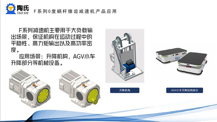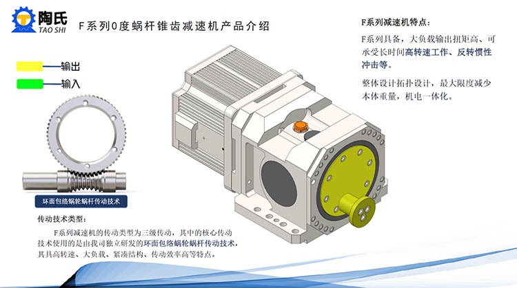 环面包络蜗轮蜗杆传动技术 传动技术类型: F系列减速机的传动类型为三级传动,其中的核心传动技术使用的是由我司独立研发的环面包络蜗轮蜗杆传动技术,其具高转速、大负载、紧凑结构、传动效率高等特点。 F系列减速机特点: F系列具备,大负载输出扭矩高、可承受长时间高转速工作、反转惯性冲击等。